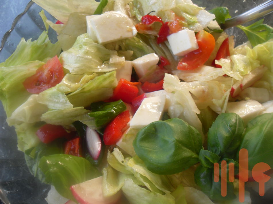 Ľadový šalát natrhajte na kúsky, pridajte nakrájané paradajky, červenú papriku a mozzarelu na kocky.