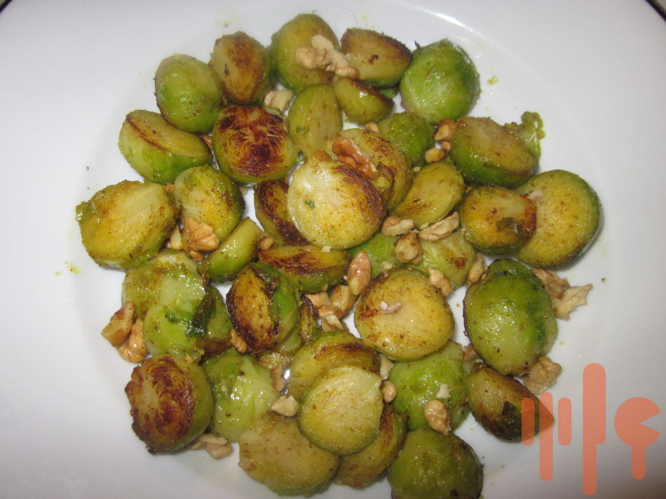 Ružičky kelu očistite z vrchných lístkov. Vodu v hrnci priveďte k varu, osoľte a vložte do nej ružičky. Povarte ich do polomäkka 10-12 minút, preceďte a nechajte odkvapkať v site. Rozkrájajte ich na polovičky. Na panvici rozohrejte olej a maslo, pridajte curry, chvíľu restujte s nalámanými vlašskými orechmi a pridajte pokrájané ružičky kelu. Restujte kým nie sú ružové.