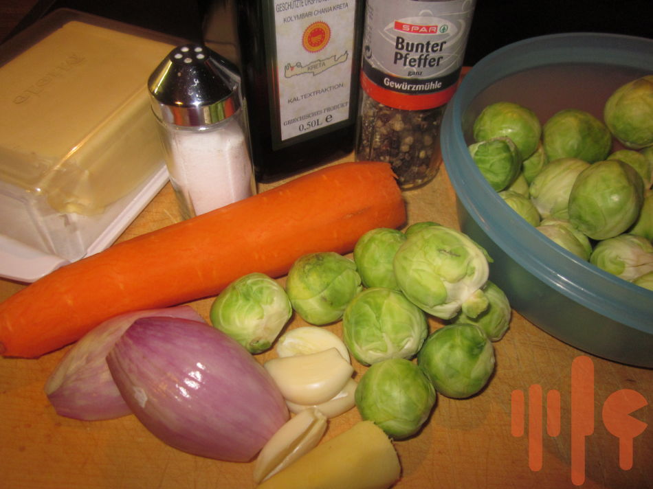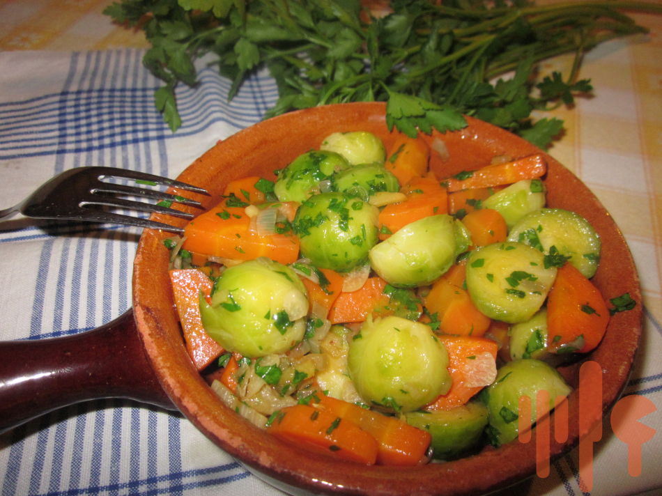 Ružičkový kel očistite z vrchných lístkov, hlúbik narežte ostrým nožom do kríža. V hrnci priveďte vodu k varu, osoľte ju a dajte do nej variť ružičky kelu. Varte do polomäka cca 10-12 minút. Ružičke sceďte a nechajte na site odkvapkať. Očistenú šalotku, cesnak a zázvor nakrájajte na drobne, na panvici rozohrejte olej a všetko spolu restujte. Mrkvu očistite a nakrájajte na kolieska a vložte ju do pavice, mierne osoľte a trochu podlejte vodou. Duste len do chrumkava. Pridajte maslo a ružičky kelu, ktoré ste prekrojili na polovičky, zmiešajte a na záver pridajte hrsť posekanej petržlenovej vňate.