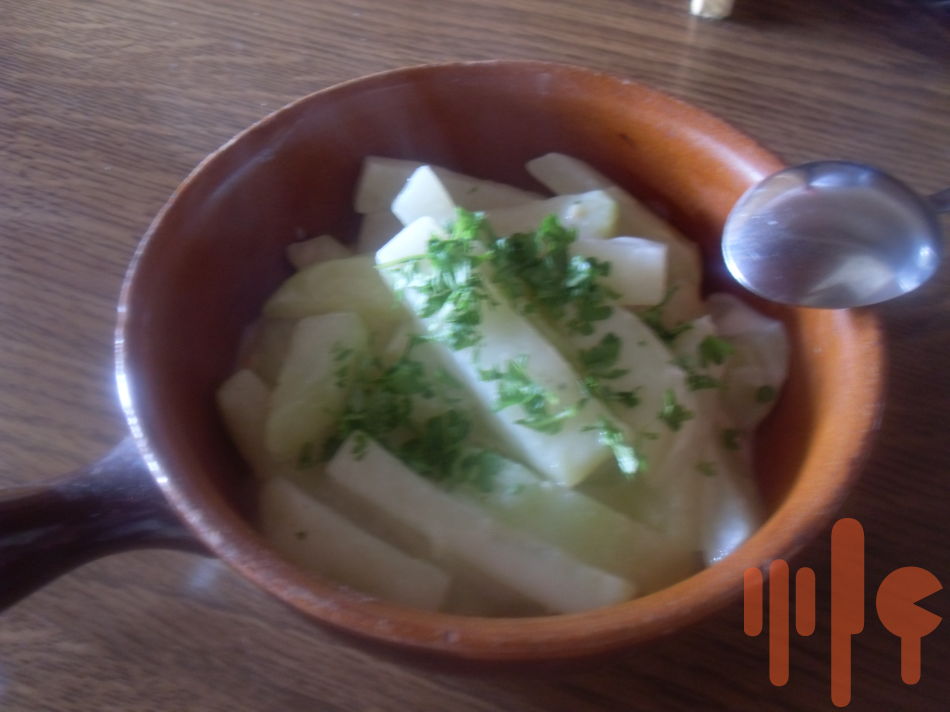 Kaleráb nakrájam na hranolky, uvarím v osolenej vode do mäkka/ môže byť vegeta/, múku rozmiešam v smotane a zahustím, okorením mušátovým orieškom a sekanou petržlenovou vňaťou.